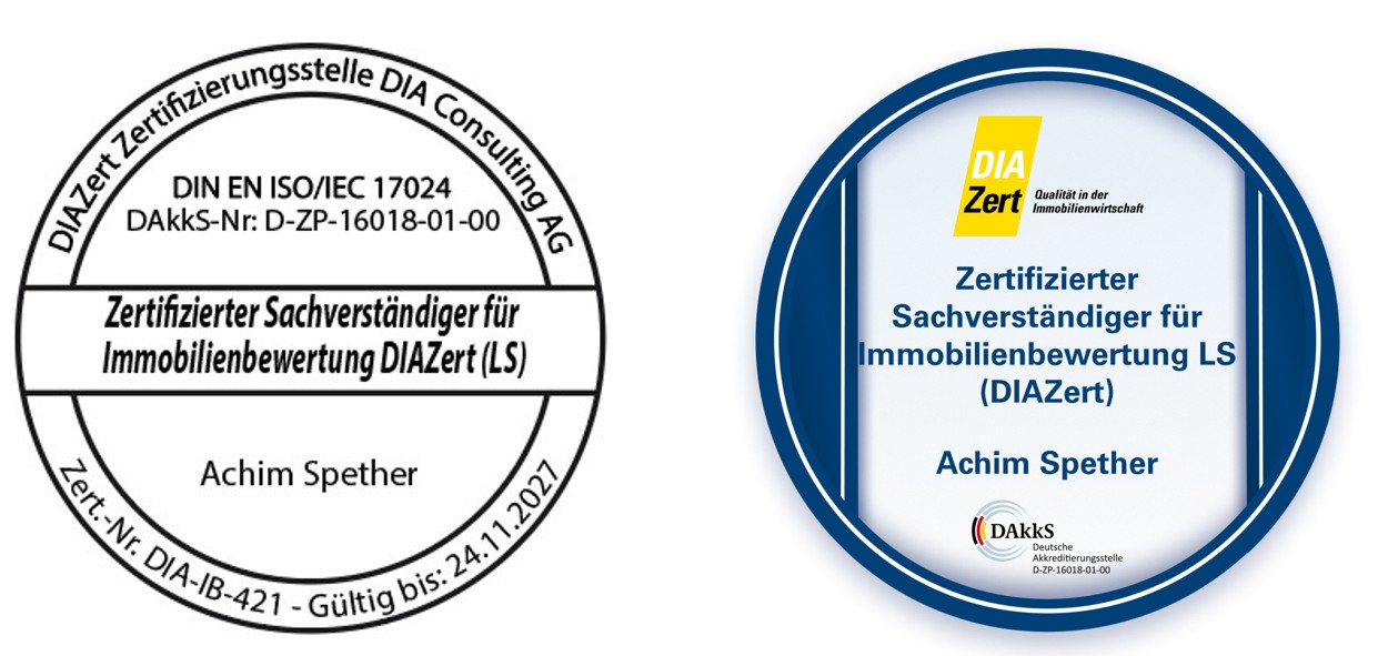 Neben der öffentlichen Bestellung und Vereidigung gehört die - auch international anerkannte - Zertifizierung von einer gemäß DIN EN ISO/IEC 17024 akkreditierten Stelle mit zur höchsten Form des Nachweises der Kompetenz eines Immobiliensachverständigen / Immobiliengutachters. Diese erfordert fortlaufende Qualitätssicherung sowie mehrjährige Berufserfahrung.